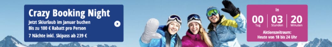 Von 18-24 Uhr buchen und bis zu 100€ Rabatt p.P. auf Skiurlaub im Januar bekommen. 7 Nächte Skiurlaub inkl. Skipass gibt’s auch schon ab 239€ pro Person. Einen Gutscheincode braucht ihr nicht, der Rabatt ist in den angegebenen Preisen bereits enthalten