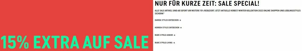 Im Marc O’Polo Onlineshop gibt es ab sofort im Sale 15% EXTRA-Rabatt auf die aktuelle Herbst/ Winter Kollektion.