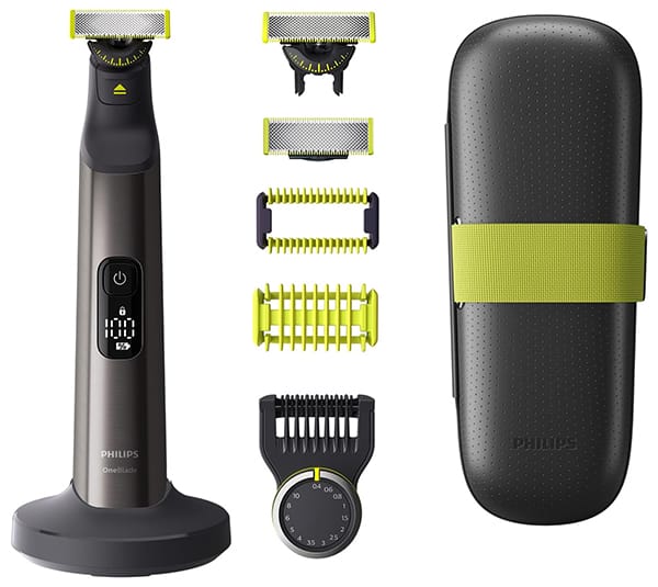 - Das Set enthält: 1x Philips OneBlade Pro 360 Face & Body, 2x 360 Klingen, 1x Originalklinge, 1x Trimmaufsatz mit 14 Längeneinstellungen (0,4-10 mm), 1x Körperset (1x aufsteckbarer Kammaufsatz für Körper und 1x Hautschutz), Ladestation, Reiseetui