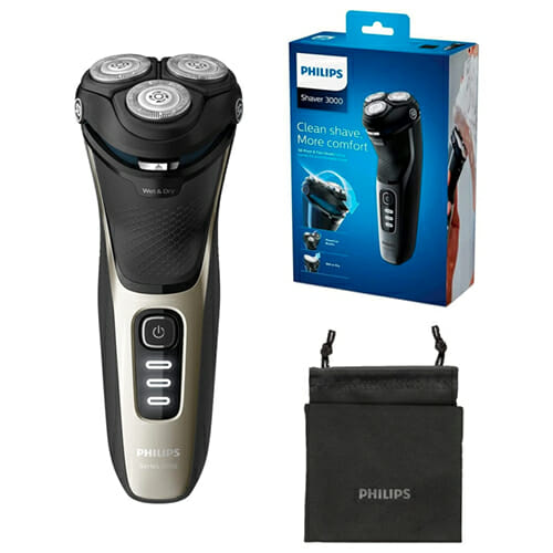 - Das Set enthält: 1 x elektrischer Philips Nass- und Trockenrasierer Shaver Series 3000 (S3230/52), 1 x Reisetasche und 1 x Schutzkappe