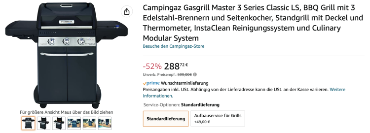 Im Preisvergleich gibt es den Campingaz Gasgrill Master 3 Series Classic LS sonst ab 525,85€ – ihr spart also 237,13€.