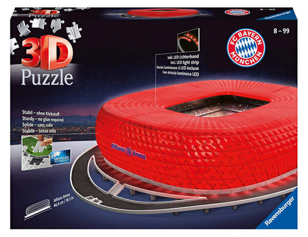 - Mit diesem 3D Puzzle von Ravensburger erleben Erwachsene und Kinder ab 8 Jahren ein einzigartiges, dreidimensionales Puzzleerlebnis und können mit nummerierten Kunststoffteilen die Allianz Arena, das ‚Wohnzimmer des FC Bayern München‘, erschaffen, die sogar bei Nacht leuchtet