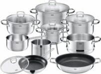 - Inhalt: Bratentopf 20 cm, Fleischtopf 16, 20, 24 cm mit Deckel, Stielkasserolle 16 cm ohne Deckel, Milchtopf 14 cm, Dämpfeinsatz 20 cm, Servierpfanne 28 cm, Pfanne 24 cm, Deckel 24 cm