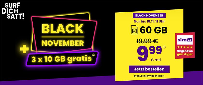 Nur noch bis Dienstag gibt es die aktuellen Sim24 Tarif-Angebote: Diese Woche bekommt ihr die Sim24 Allnet Flat im 1&1 5G Netz mit z.B. 90 GB Datenvolumen für nur 14,99€ monatlich.