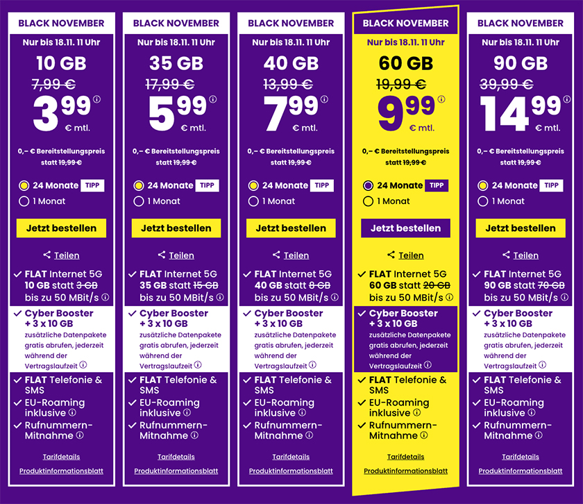 • Flat Internet mit 10, 35, 40, 60 bzw. 90 GB 5G (bis 100 Mbit/s)