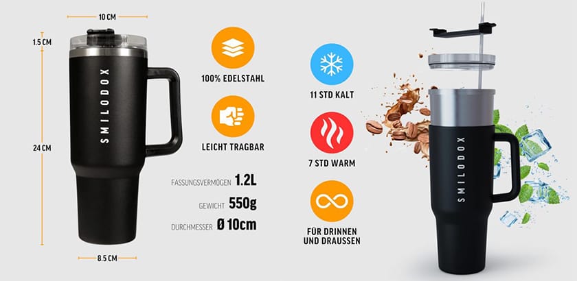 • PERFEKTE TEMPERATURKONTROLLE: Der SMILODOX 1,2L Trinkbecher mit Deckel und Strohhalm hält Ihre Getränke stundenlang auf der idealen Temperatur, egal ob heiß oder kalt. Die doppelwandige Vakuumisolierung sorgt dafür, dass Ihre Lieblingsgetränke immer die perfekte Temperatur haben. Verabschieden Sie sich von lauwarmen Getränken und genießen Sie immer die perfekte Erfrischung oder Wärme.