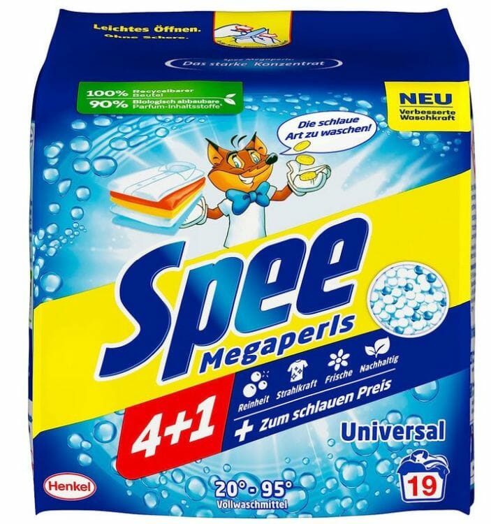 - Spee Megaperls kommt in einem 100 Prozent recycelbaren Beutel und hat eine Formel mit 90 Prozent biologisch abbaubaren Parfum-Inhaltsstoffen