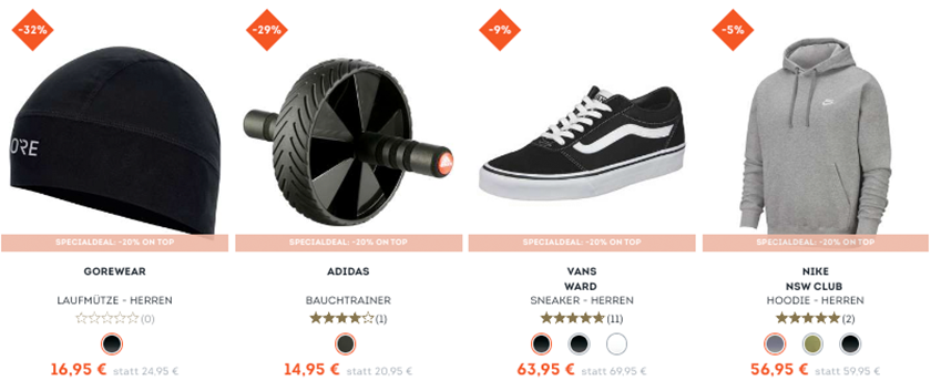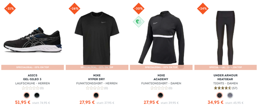 Mit von der Partie sind auch etliche Artikel von Top-Marken wie z.B. Nike, Under Armour oder auch The North Face. Da bereits einige reduziert sind, lassen sich hier also ein paar gute Schnapper machen.