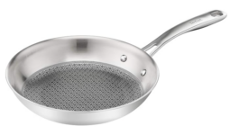 - Edelstahlpfanne mit kratzfester Mesh-Beschichtung: Lebensmittel haften weniger an, die Pfanne lässt sich im Vergleich zu unbeschichteten Edelstahlprodukten leichter reinigen