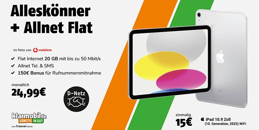 Tipp! klarmobil (Vodafone) Allnet Flat 20 GB für 24,99 mtl. + iPad (10,9 Zoll, 10. Gen) für 15€ + 150€ Bonus