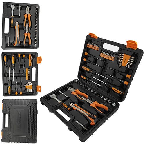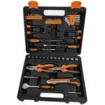 - Koffer bestehend aus: 4x Präzisionsschraubendreher, 2x Schraubendreher, 8x Inbusschlüssel mit Rahmen (1.5mm – 6mm), 1x Cuttermesser, 1x beschichtete Drahtschneidezange, 1x beschichtete Spitzzange, 1x 1/4″-Ratschenschlüssel, 1x Antriebs-Spinnergriff, 1x 58mm Bithalter mit Magnet, 1x Verlängerungsstange, 1x 1/4″ Steckschlüssel