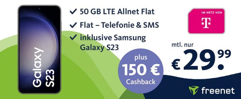 Top! freenet Telekom Green LTE 50 GB für 29,99€ mtl. + Samsung Galaxy S23 für 179,99€ + 150€ Cashback