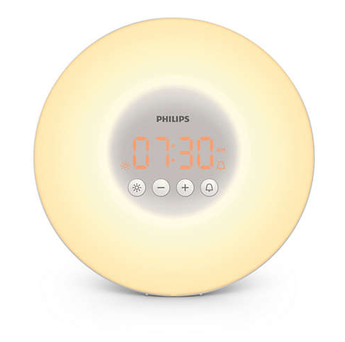Über das Gerät: „Die durch den Sonnenaufgang in der Natur inspirierte einmalige Kombination aus Licht und Ton des Philips Wake-up Lights weckt Sie auf natürlichere Weise. Sie wachen erholter auf, und Ihnen fällt das Aufstehen leichter.“
