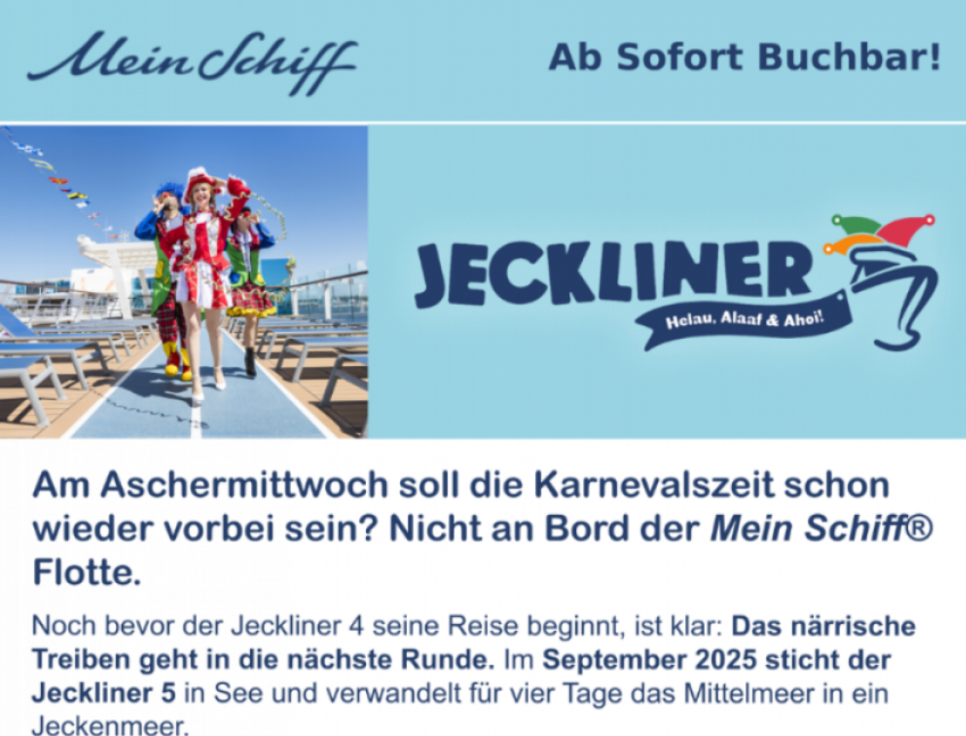 Vom 19.09. – 23.09.2025 wird die Mein Schiff 2 zur schwimmende Narrenhochburg. Beim Jeckliner 5 erobern Prinzessinnen, Matrosen und Piraten das Mittelmeer und feiern eine Kostümparty der Superlative.
