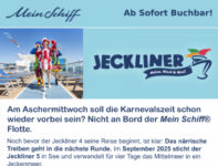Vom 19.09. – 23.09.2025 wird die Mein Schiff 2 zur schwimmende Narrenhochburg. Beim Jeckliner 5 erobern Prinzessinnen, Matrosen und Piraten das Mittelmeer und feiern eine Kostümparty der Superlative.