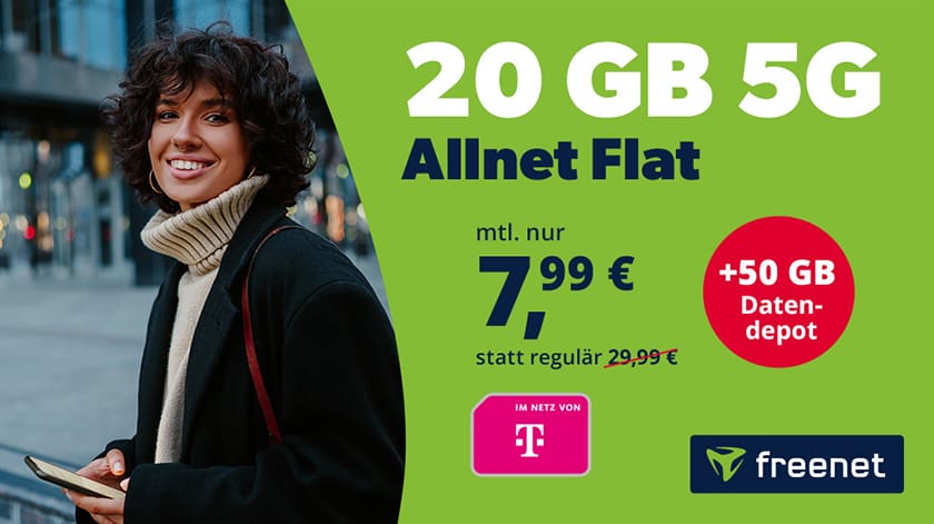 Verlängert: freenet Telekom 5G Allnet Flat mit 20 GB Daten für nur mtl. 7,99€ + 50 GB Datendepot!