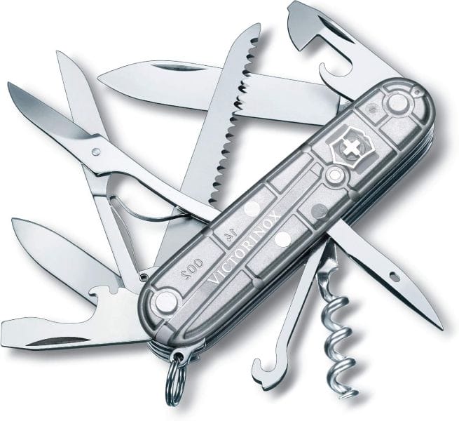 - Schweizer Taschenmesser mit 15 Funktionen, darunter große Klinge, Holzsäge und Schere