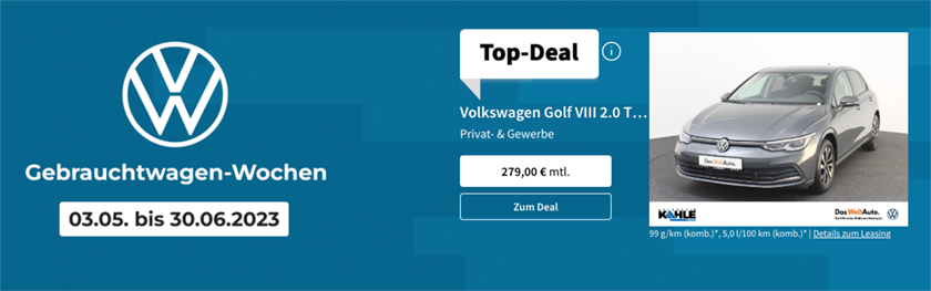 Aktuell laufen bei LeasingMarkt.de bis einschließlich 30.06.23 die großen VW Gebrauchtwagen-Wochen mit vielen verschiedenen Leasing-Angeboten.