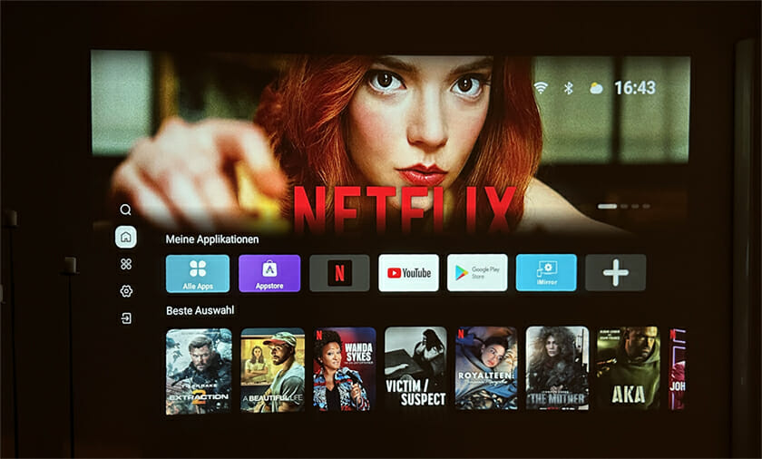 Ran an den Strom und eingeschaltet, richtet sich das Bild dank automatischer Trapezkorrektur und Autofokus vollautomatisch aus, was ich persönlich sehr praktisch finde. Zunächst müsst ihr ein paar Einrichtungsoptionen einstellen, unter anderem die Wahl der Region, die gewünschte Sprache und das Verbinden mit dem heimischen WLAN-Netzwerk. Anschließend landet ihr auf der individuell angepasste Startseite auf Basis von Android 9.0. Diese ähnelt der eines klassischen Smart TVs und zeigt euch die bis dato vorinstallierten Apps – unter anderem YouTube, Netflix und ein App Store. Die Navigation gestaltet sich dank der mitgelieferten Fernbedienung und ansprechenden Aufmachung der Benutzeroberfläche sehr intuitiv.