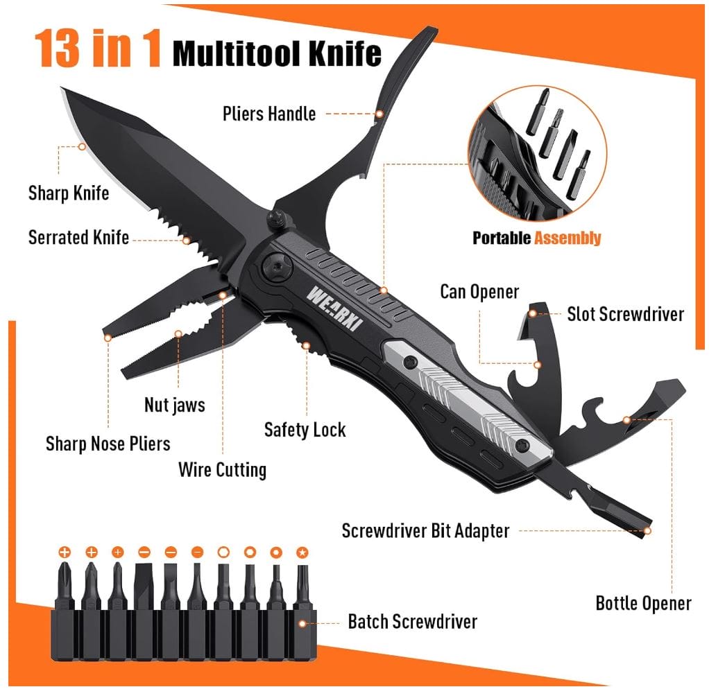 - Ein gezahntes Messer, eine Spitzzange, eine Drahtzange, eine normale Zange, einen Flaschenöffner, einen Dosenöffner, einen Schlitzschraubendreher und 10 austauschbare Schraubendreherbits. Egal, ob Sie mit Familie und Freunden wandern oder campen, WEARXI hochwertige Klappmesser ist der perfekte Mehrzweckbegleiter, der in einer Vielzahl von Szenarien gute Dienste leistet! Ein perfektes Geschenk für Männer/Frauen, die das Leben im Freien lieben.