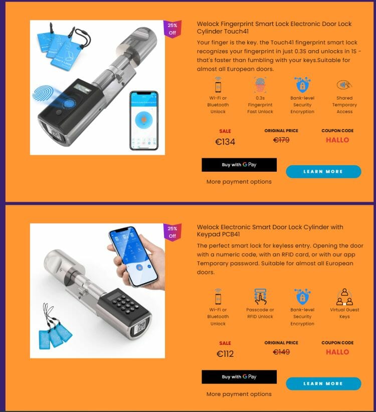 Die verschiedenen Modelle sind auf der Aktionsseite gelistet und mit dem Gutscheincode HALLO bekommt ihr 25% Rabatt auf den Welock Schließzylinder PCB41 mit digitalem Zahlenschloss und App Unterstützung, sowie den Welock SECBR Schließzylinder mit Fingerprint-Sensor und App Unterstützung.